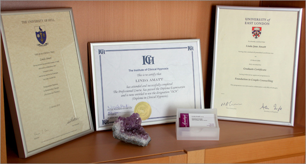 In 2011 she obtained a diploma in Hypnotherapy so that she could offer clients an additional type of therapy working more with the unconscious mind. Linda has since helped many clients to quit smoking, lose weight and ressolve problems such as anxiety, stress, depression, phobias and many more.
